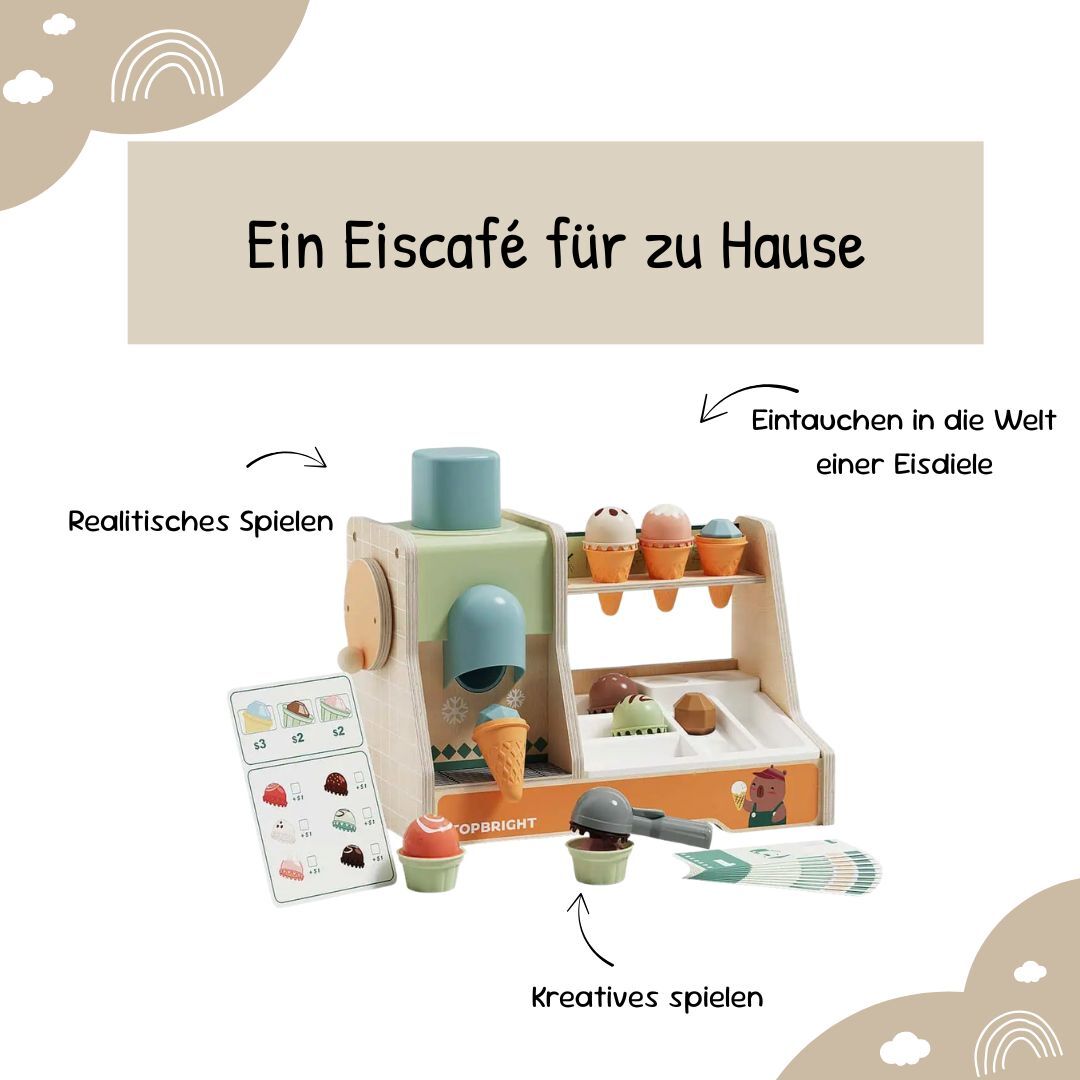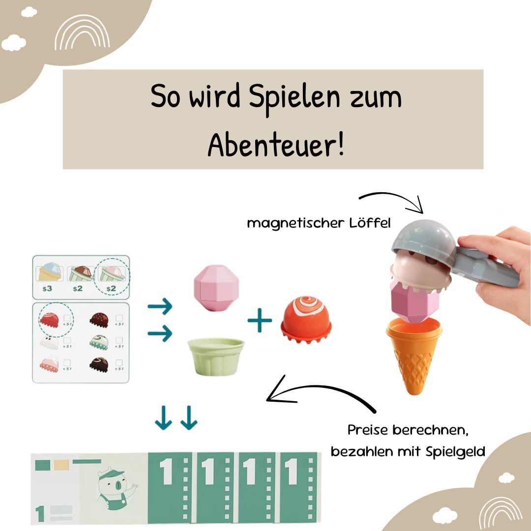 Mit der Ice Cream Boutique verwandeln sich Kinder in kleine Eisverkäufer oder Kunden! Dieses detailreiche Holzspielset begeistert mit einer funktionierenden Eismaschine, einem magnetischen Portionierer, bunten Eiskugeln, Toppings, Bechern, Hörnchen, Spielgeld und illustrierten Bestellkarten. So entsteht fantasievoller Rollenspielspaß, der Kreativität, Motorik und erste Rechenfähigkeiten fördert, perfekt für gemeinsames Spielen mit Freunden oder auch allein.